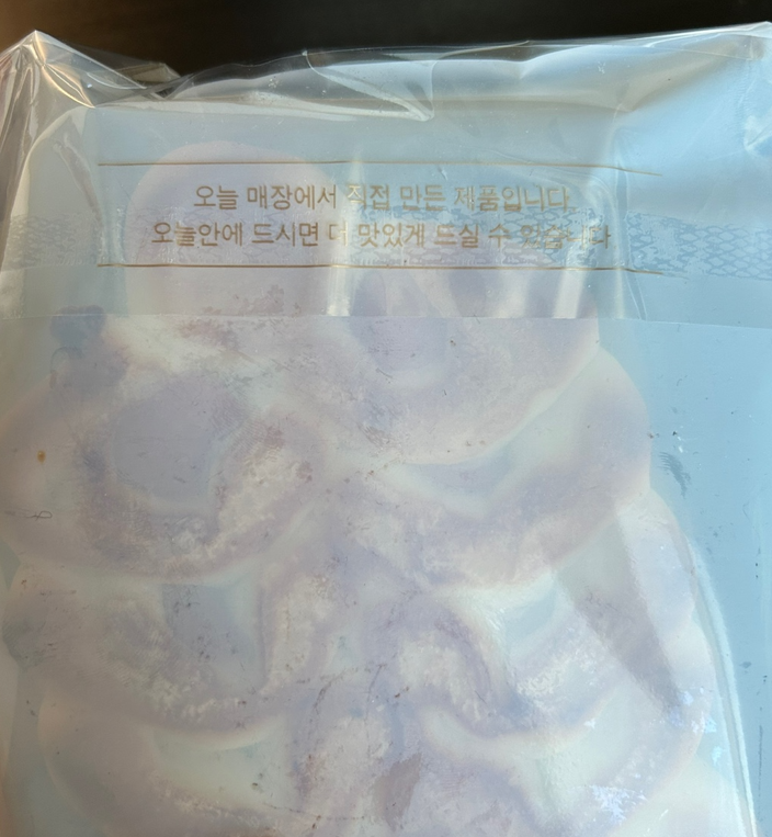 포장지 뒷면에는 '오늘 매장에서 직접 만든 제품입니다. 오늘 안에 드시면 더 맛있게 드실 수 있습니다'라는 문구가 있습니다.